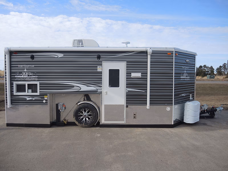 El interior está diseñado pensando en el pescador. En lugar de un suelo sólido convencional, estas caravanas cuentan con varios agujeros precortados con tapas selladas. Una vez que la caravana está en posición, el propietario puede retirar estas tapas, perforar el hielo debajo y pescar directamente desde el interior de su refugio. Esto elimina la necesidad de sentarse a la intemperie, expuesto a temperaturas bajo cero y vientos cortantes.