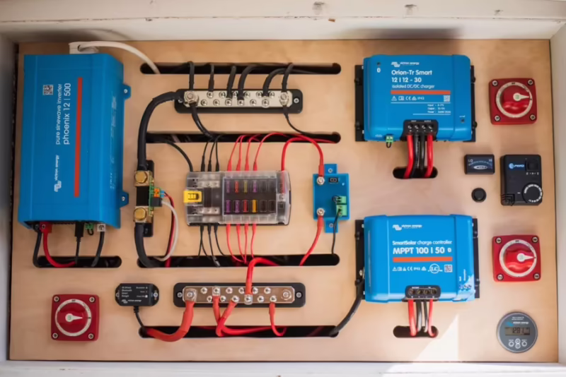 - Sistema de 12V DC (Corriente Continua): Este es el sistema de baja tensión alimentado por las baterías de tu RV. La electricidad fluye en una sola dirección, de ahí el nombre de 'continua'. Este sistema es responsable de alimentar elementos esenciales para la vida nómada, especialmente cuando no estás conectado a una fuente de poder externa. Alimenta las luces interiores, la bomba de agua, los ventiladores de techo, los detectores de gas, el encendido del calentador de agua y la calefacción, y el panel de control del refrigerador. Es el sistema que te permite ser autosuficiente.