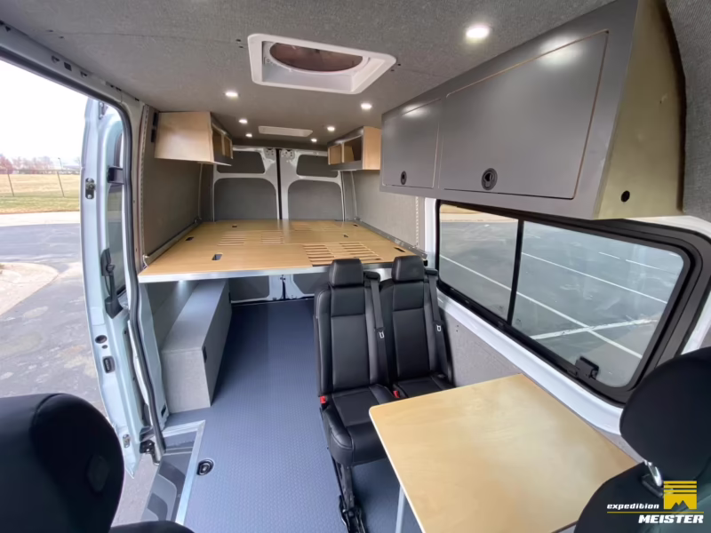 La Mercedes-Benz Sprinter, especialmente el modelo de techo alto con batalla de 170 pulgadas (largo), es una de las mejores opciones. Ofrece un generoso espacio interior, techos altos y suficiente sitio para crear zonas de dormitorio dedicadas, almacenamiento, una pequeña cocina e incluso un baño.