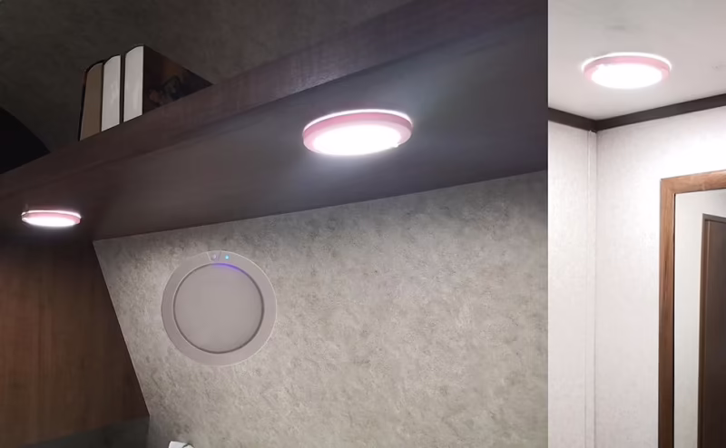 | Plafones (Flush Mount) | Ahorro de espacio, luz uniforme, fácil instalación, bajo consumo. | Menos decorativas que otras opciones. | Toda la casa rodante (sala, pasillos, baño). |