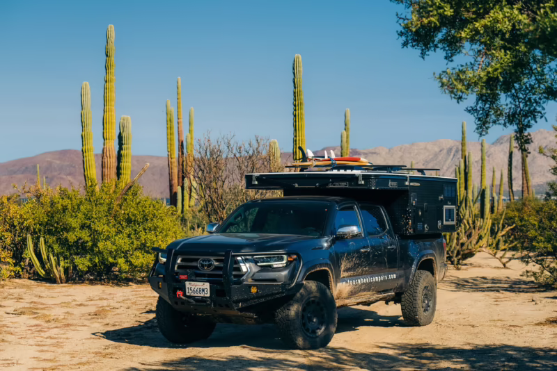 Considerado por muchos como el rey de los campers pop-up todoterreno. El Fleet combina una construcción de aluminio soldado increíblemente duradera con un perfil bajo que minimiza la resistencia al viento. Ofrece varias distribuciones interiores, una cama queen-size, cocina y un tanque de agua dulce de 20 galones. Su peso de 1,045 libras en seco lo hace una opción viable para una Tacoma con la caja de 6 pies, siempre que se vigile el peso del equipo adicional.